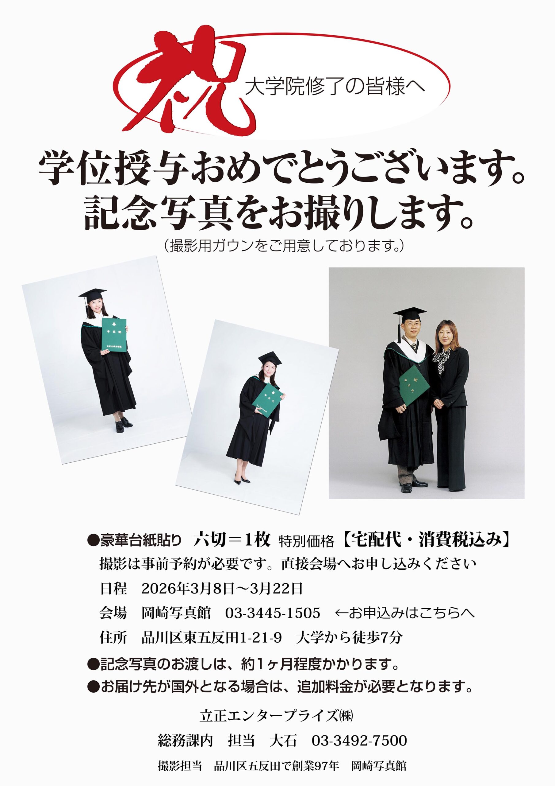 この春、立正大学大学院卒業生の皆様へ 当店でガウンを着て「卒業写真」お撮りいたします
